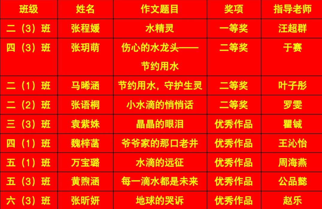 在南京市栖霞区水务局、南京市栖霞区教育局、共青团南京市栖霞区委员会共同组织的栖霞区“节水故事”作文征集活动中,我校张程媛等4位同学获奖,袁紫姝等5位同学的作文获“优秀作品”,汪超群老师获“优秀指导老师”。具体名单如下: